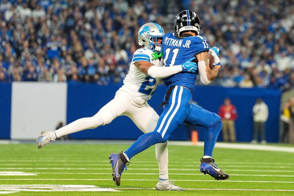Detroit Lions cornerback Amik Robertson (21) tackles Indianapolis Colts wide receiver Michael Pittman Jr. (11) during the first half at Lucas Oil Stadium in Indianapolis, Ind. on Sunday, Nov. 24, 2024.