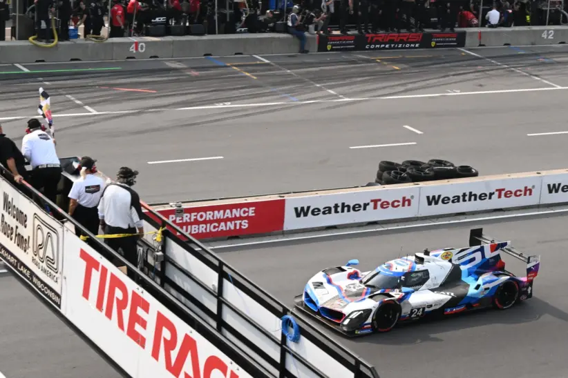 The GTP Team RLL BMW M Hybrid of Philipp Eng and Dries Vanthoor (24) takes the checkered flag to win the IMSA Motul SportsCar Grand Prix on Sunday, August 3, 2025, at Road America in Elkhart Lake, Wisconsin.