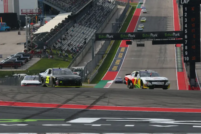 Garrett Smithley; Mar 23, 2024; Austin, Texas, USA; NASCAR Xfinity driver Alex Labbe (35) and driver Justin Allgaier (7) during the Focused Health 250 at Circuit of the Americas. Mandatory Credit: Michael C. Johnson-Imagn Images